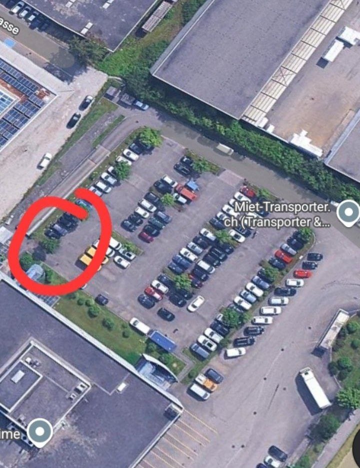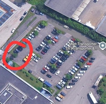 Fahr nach dem Abbiegen von der Hauptstraße ins Areal rechts am großen Parkplatz entlang bis ganz nach hinten. Bei der letzten Parkreihe biegst du links ab und fährst wieder bis ans Ende. Dort steht dein Lieferwagen für dich bereit.